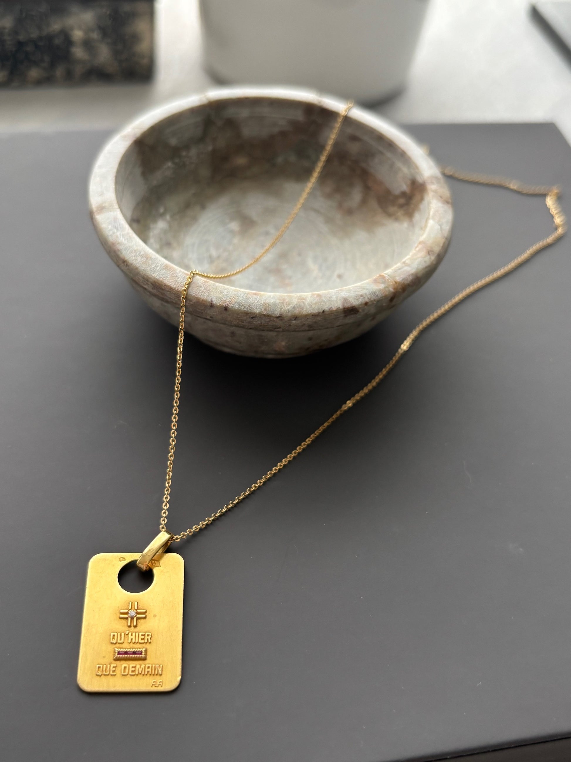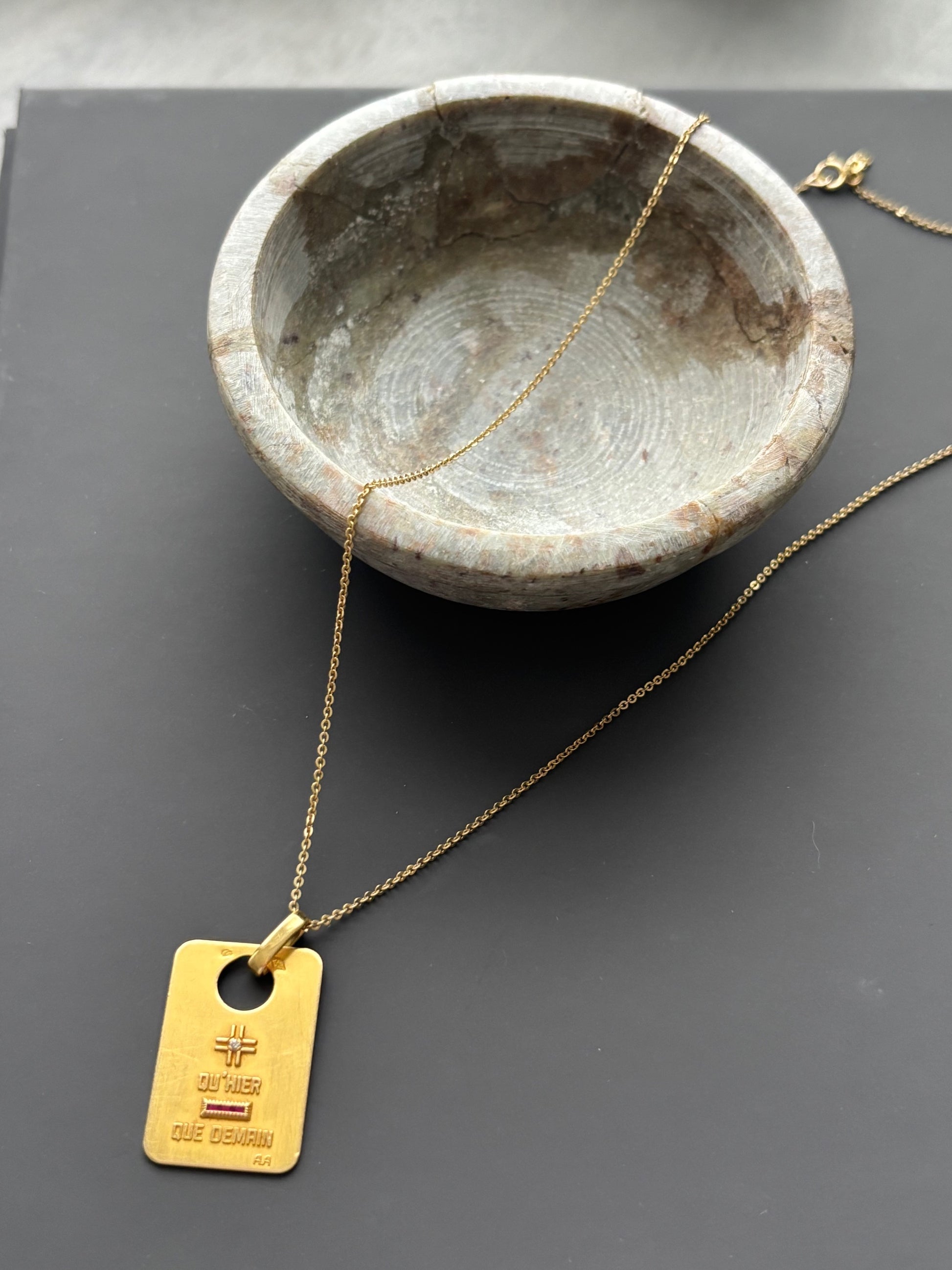 A Augis Charm Pendant with Ruby and Diamond on an 18k Gold Chain